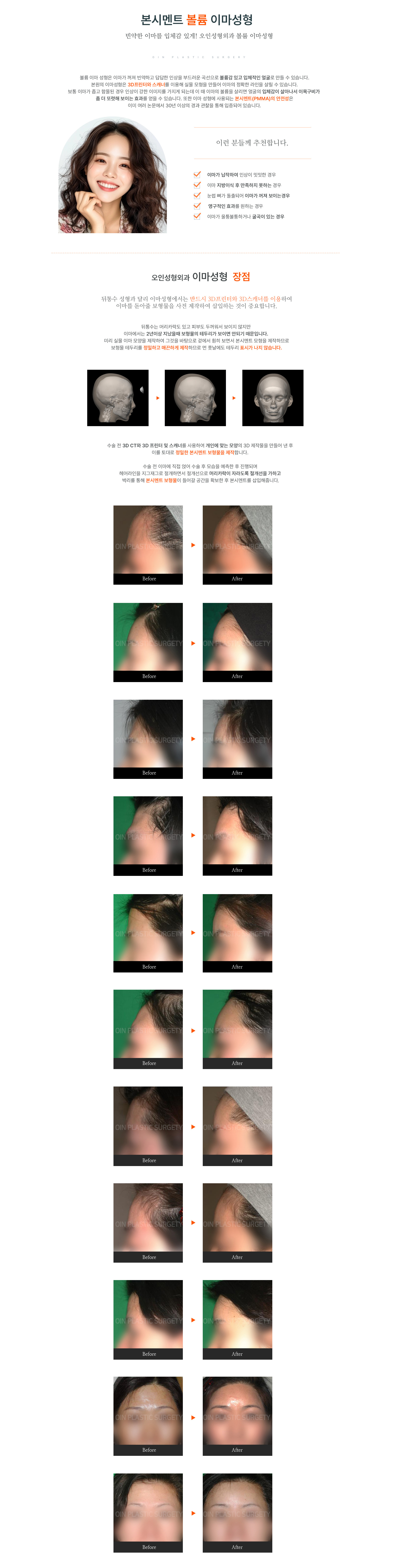 납작한 이마, 울퉁불퉁한 짱구 이마를 균형잡힌 아름다운 이마로 만들어 드립니다. 오인 본시멘트 이마성형